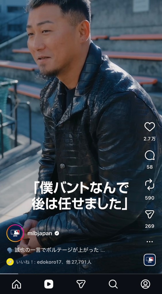 投稿された動画は、シカゴ・カブスの鈴木誠也(31)との秘話を語る中田の様子をおさめたもの。打席に向かう鈴木から、「僕バントなんで後は任せました」と告げられたという。中田は、「なんやねんこいつ めっちゃかっこええやんけ」と衝撃を受けた心境を明かしつつ、そのひと言で、「バチンと僕のなかでボルテージがあがった」「死んででも打ってやる、という気持ちで打席に立ったのを覚えている」と回顧。最後には、「僕の中では誠也が打たしてくれたのかなと思ってますけどね」と、感慨深げにエピソードを締めくくった。