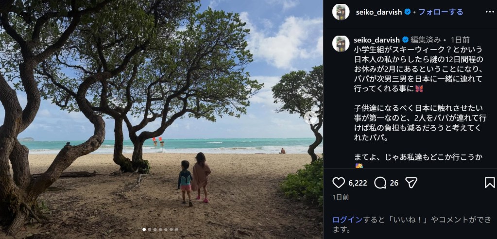 サンディエゴ・パドレス所属のダルビッシュ有(39)の妻・ダルビッシュ聖子(45)が、16日にInstagramを更新。子どもたちと南の島を訪れたことを報告した。