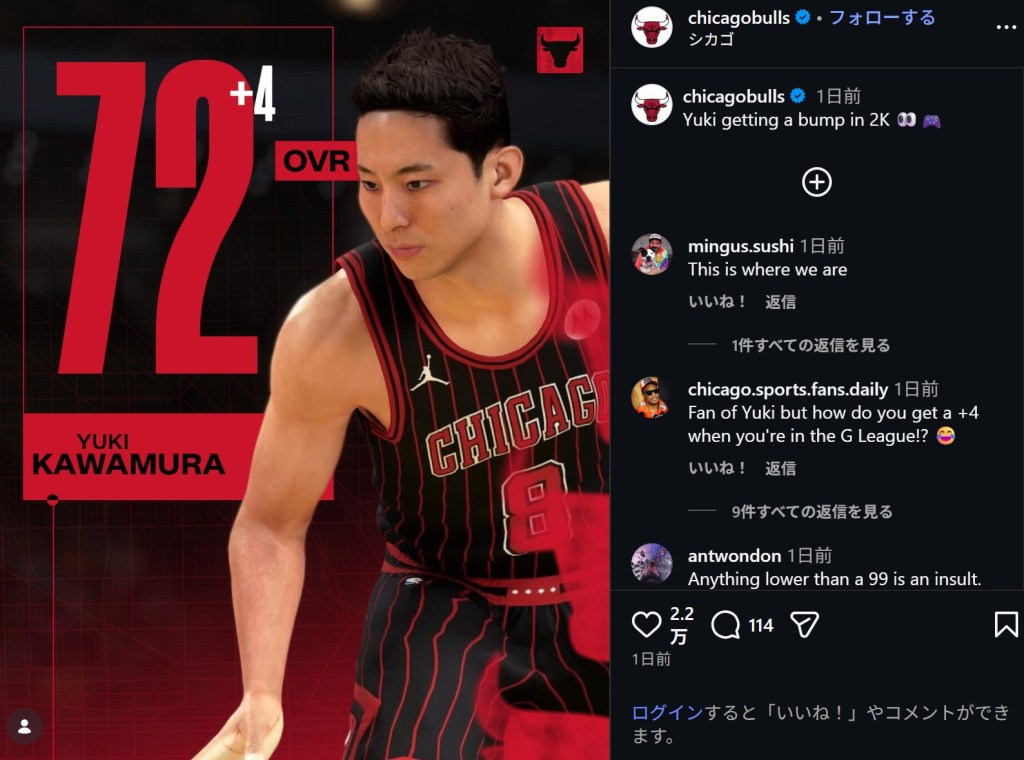 シカゴ・ブルズは18日、公式Instagramを更新。河村勇輝(24)が登場するNBAゲーム『NBA 2K26』の最新レーティングが大幅に上昇したことを伝え、大きな反響を呼んでいる。