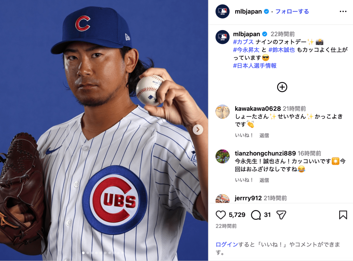 MLB Japanが2月18日、Instagramを更新。シカゴ・カブス所属の今永昇太(32)、鈴木誠也(31)の写真を投稿した。