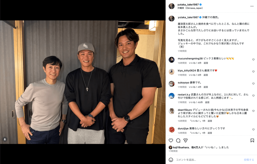 武と藤浪が焼肉を食べに行ったところ、隣の席に偶然坂本がいたという。投稿された写真には、ほほえみながらカジュアルな装いの3人が収められており、3人の身長差が目立つ1枚となっている。読売ジャイアンツと横浜DeNAベイスターズの球団HPによると、坂本は身長186センチ、藤浪は197センチあり、170センチの武との差が際立っている。武は「ジョッキーの中では、これでもかなり背が高い方なんです(笑)」ともつづった。