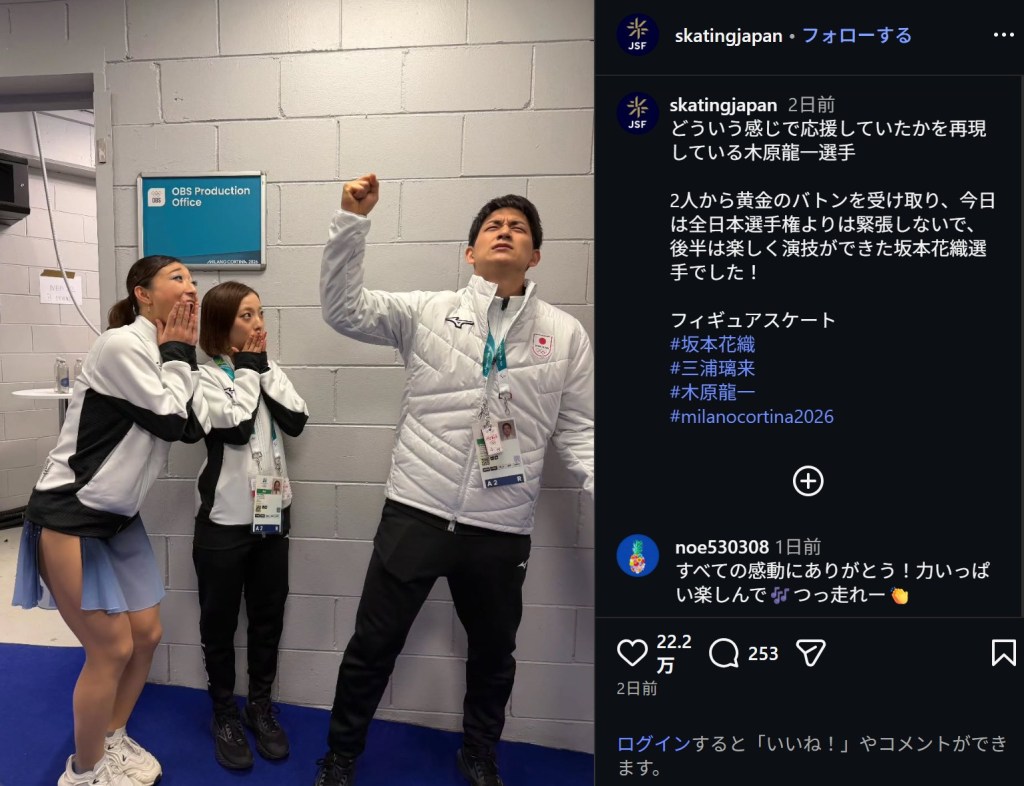 「どういう感じで応援していたかを再現している木原龍一選手」と、題されて投稿された写真は、険しい表情を浮かべる木原と、口元に手を当てつつ、その様子を少し大げさに見つめる三浦。その隣には、女子シングルで銀メダルを獲得した坂本花織(25)が並んでいる。