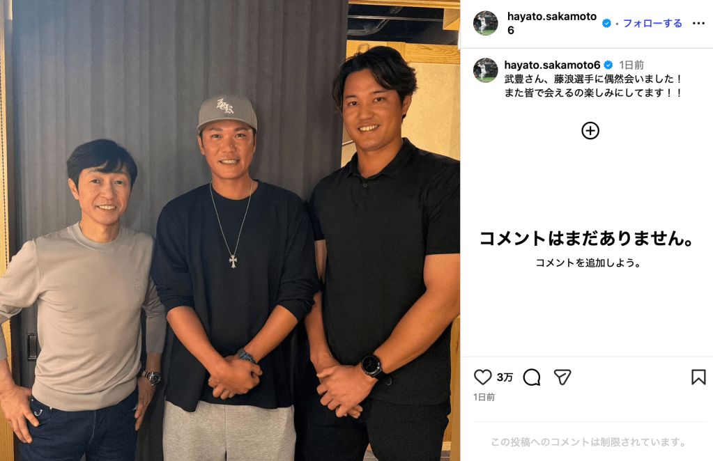 読売ジャイアンツ所属の坂本勇人(37)が2月20日、Instagramを更新。中央競馬騎手の武豊(56)と横浜DeNAベイスターズ所属の藤浪晋太郎(31)のスリーショットを投稿した。