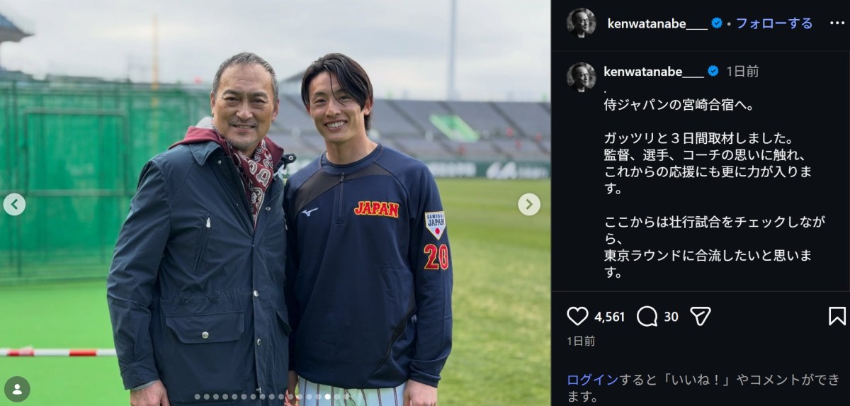 俳優の渡辺謙(66)が20日、Instagramを更新。侍ジャパンの宮崎合宿を訪れた際の豪華なオフショットを公開した。