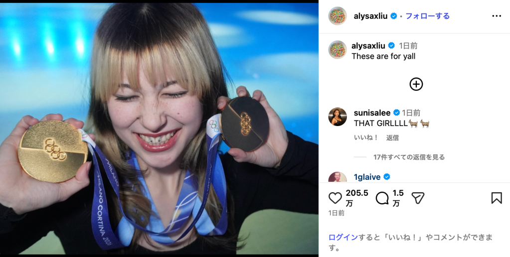 「These are for yall」と投稿されたのは、両手に金メダルを持ってほほ笑む写真。アリサはミラノ・コルティナオリンピック女子シングル、団体戦で金メダルを獲得している。投稿は205万超のいいねを獲得し、1万5000件以上のコメントが寄せられた。