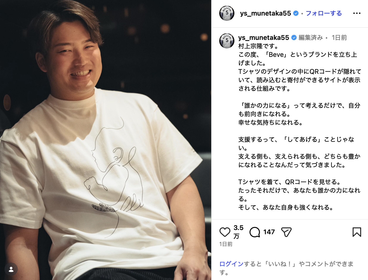 村上宗隆「世界を揺らしませんか?」小児がん支援に意欲 Tシャツブランド立ち上げに「朝から涙」と感動の声