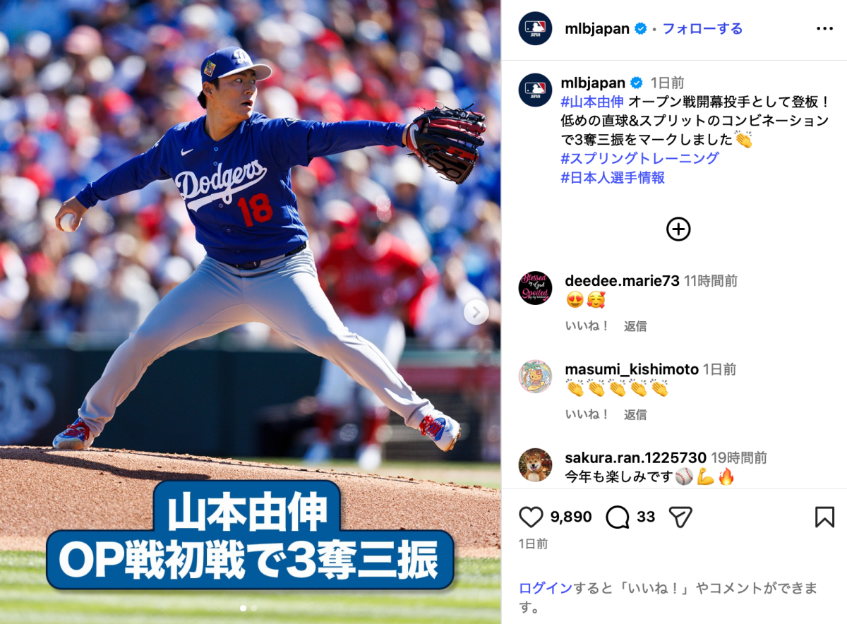 「#山本由伸 オープン戦開幕投手として登板!」と投稿されたのは、ボールを振りかぶる山本の姿。MLB Japanは「低めの直球&スプリットのコンビネーションで3奪三振をマークしました」と試合動画も合わせて投稿した。