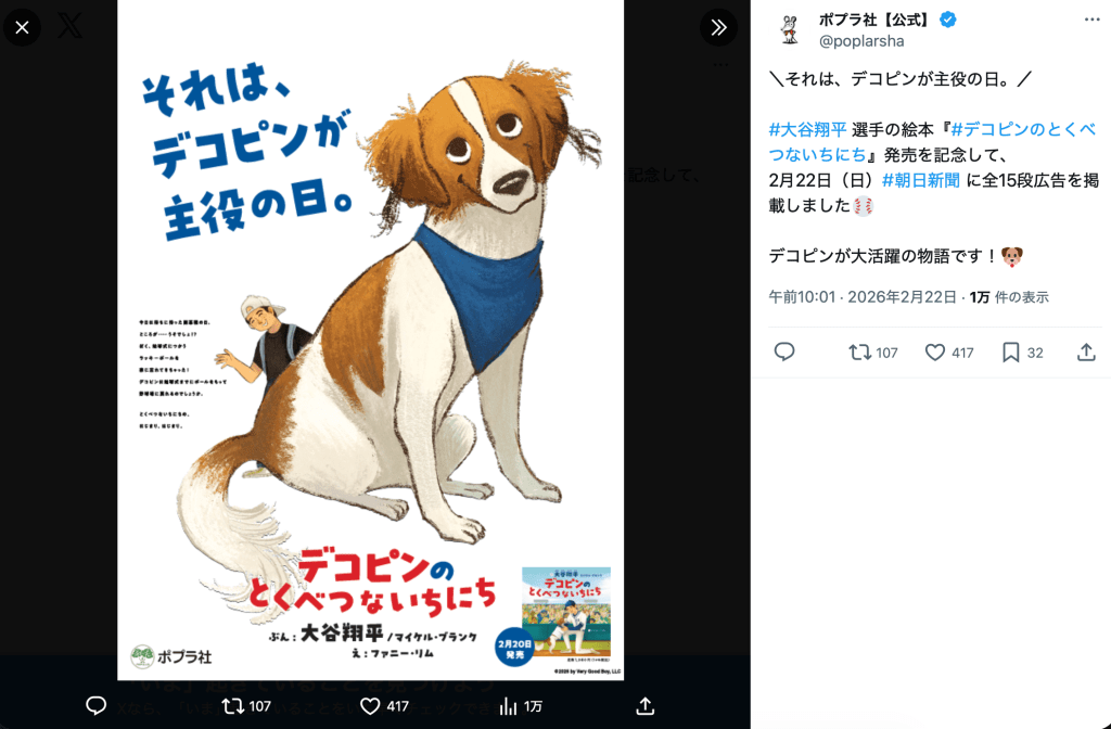「#大谷翔平 選手の絵本『#デコピンのとくべつないちにち』発売を記念して、2月22日(日)#朝日新聞 に全15段広告を掲載しました」と投稿されたのは、デコピンがこちらを見つめる新聞広告の画像。ポプラ社「デコピンが大活躍の物語です!」と呼びかけた。本書は2月20日より販売を開始している。