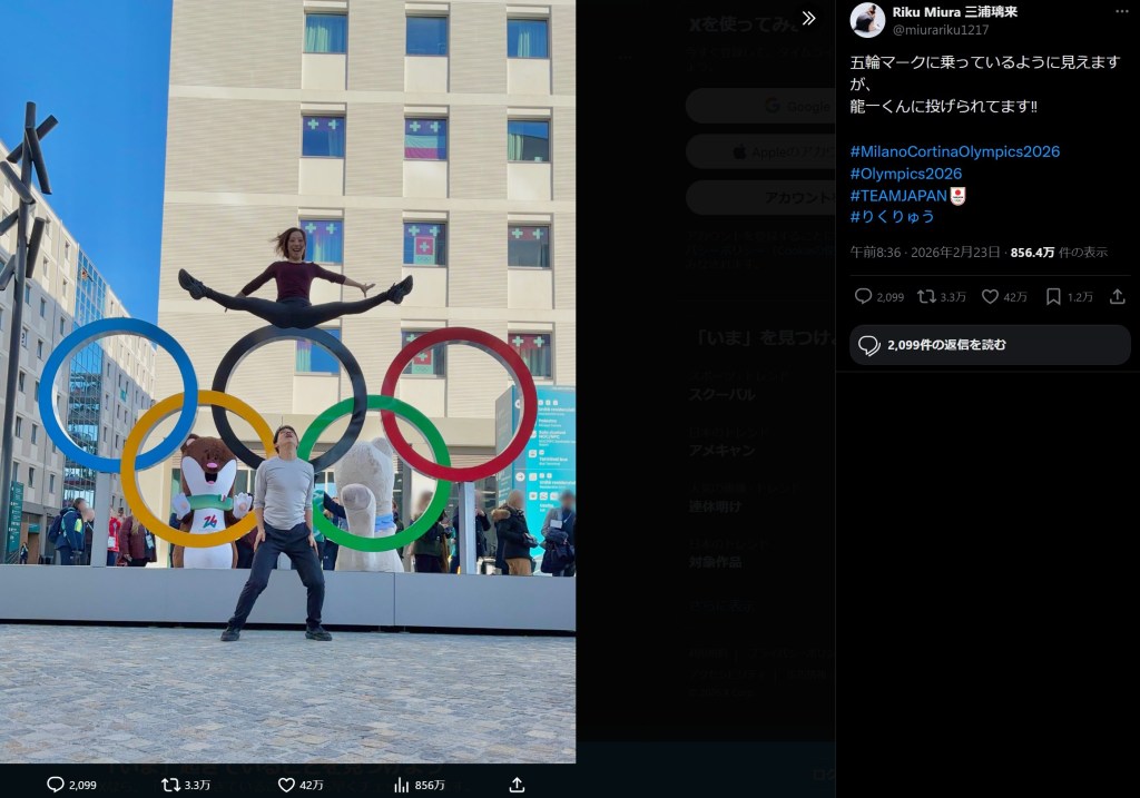 この投稿には、Xユーザーから「りくりゅう、あっぱれ!」「うわあああ璃来ちゃんこの写真神すぎる!!!」「高さが異次元です」「ぴったり五輪の上に重なってますね」「地上での跳躍も美しい、納得の信頼感ですね」といった驚きと絶賛のコメントが寄せられている。