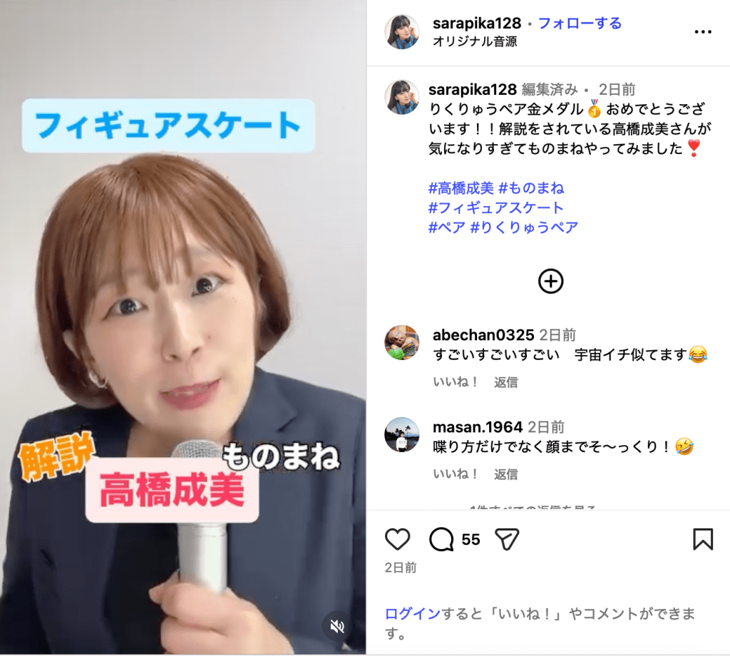 ものまねタレントの沙羅(43)が2月21日、Instagramを更新。フィギュアスケート選手でミラノ・コルティナ五輪で解説者を務めた高橋成美(34)のものまね動画を投稿した。