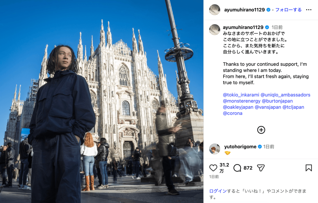 「みなさまのサポートのおかげでこの地に立つことができました」と投稿されたのは、ミラノ大聖堂の前で佇む平野の写真。平野は「ここから、また気持ちを新たに自分らしく進んでいきます」と決意を新たにした。平野はスノーボード男子ハーフパイプに出場し、骨折しながらも7位に食い込んだ。