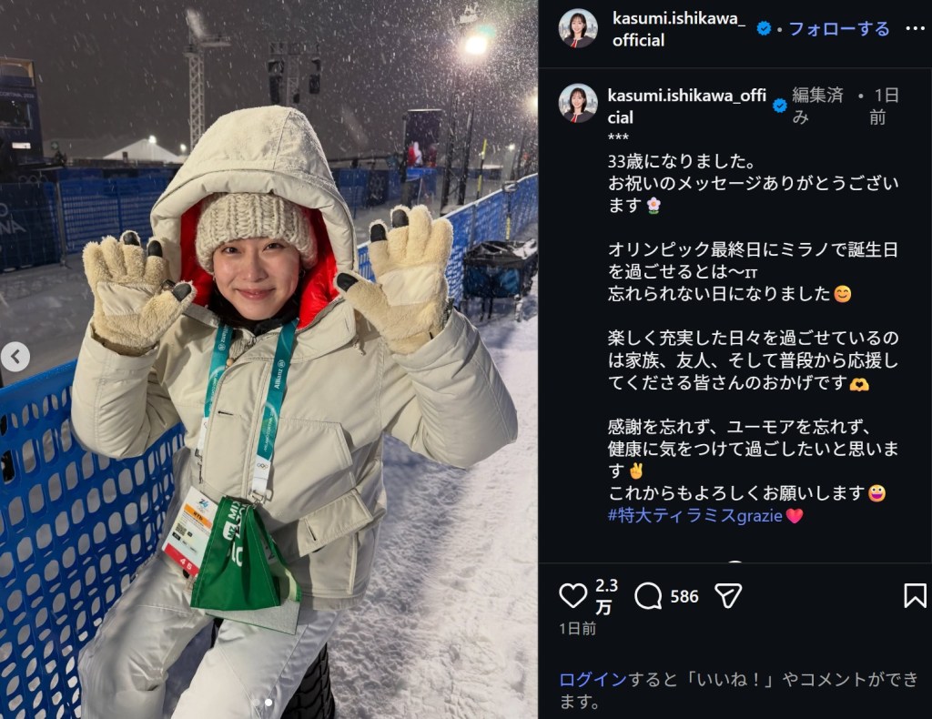 「オリンピック最終日にミラノで誕生日を過ごせるとは~」というコメントと共に投稿された写真は、大雪が降る五輪会場で、可愛らしい笑顔を浮かべるソロショット。毛糸の帽子に手袋、ボリューム感あるダウンジャケットでしっかり防寒した「真っ白コーデ」を披露した。