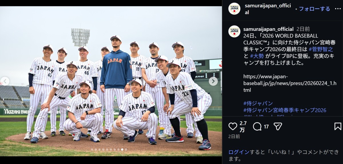 野球日本代表「侍ジャパン」は25日、公式Xを更新。宮崎キャンプの最終日を迎えたことを報告し、マウンド上で撮影された豪華な記念写真を投稿した。