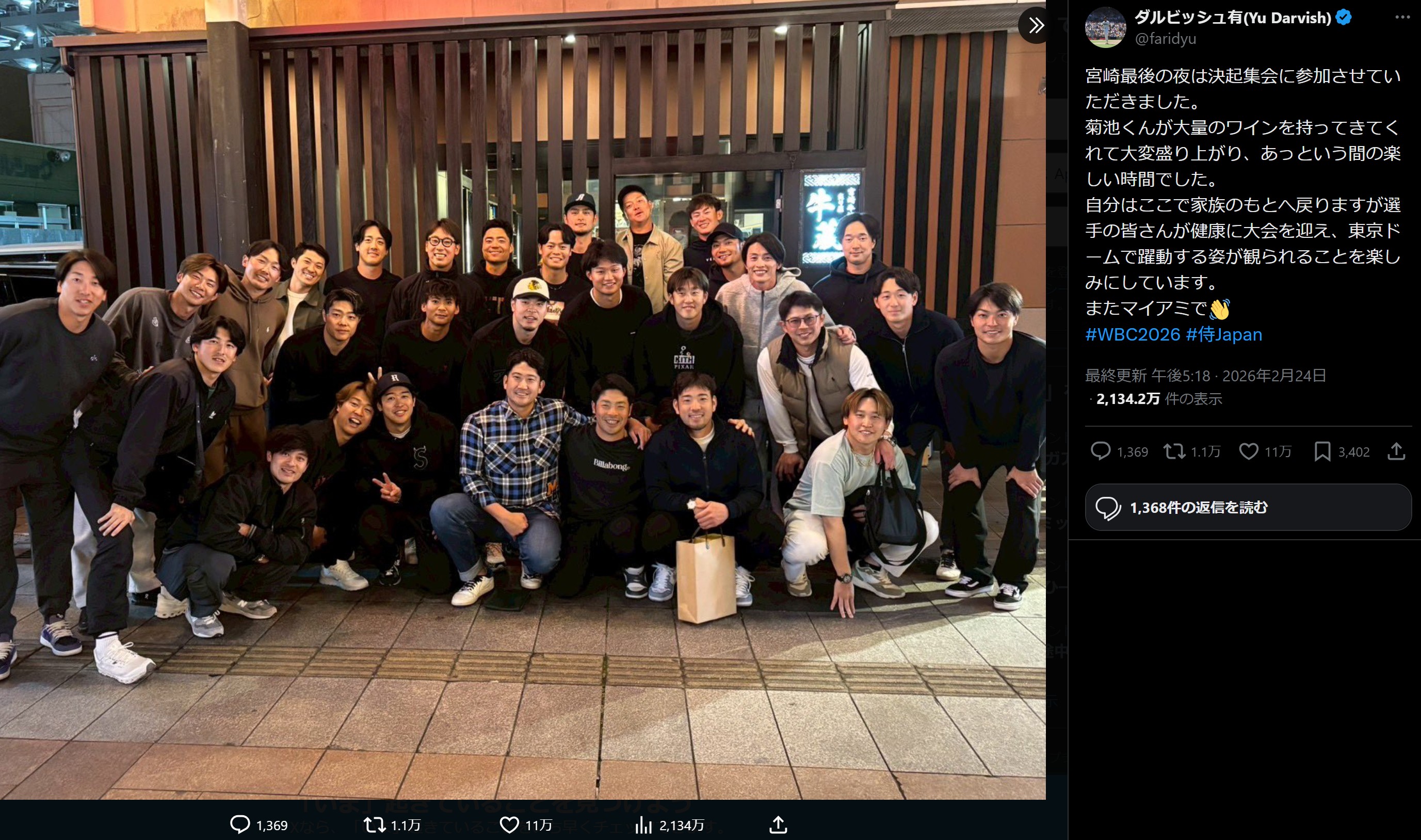 「店員側だったら発狂してる」侍ジャパン、豪華メンバーが宮崎の夜に決起集会! ダルビッシュ有は熱い“再会の約束”も