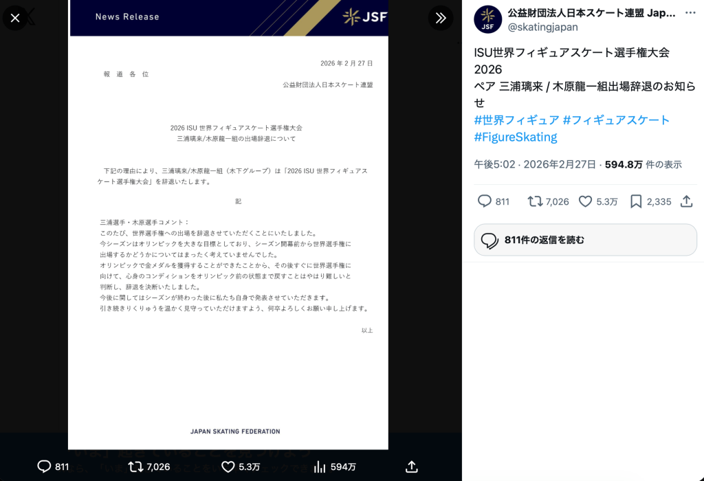 投稿されたのは、三浦と木原が3月に開催されるISU世界フィギュアスケート選手権大会2026を出場辞退するお知らせ。三浦・木原ペアからは「このたび、世界選手権への出場を辞退させていただくことにいたしました」とコメントも発表された。