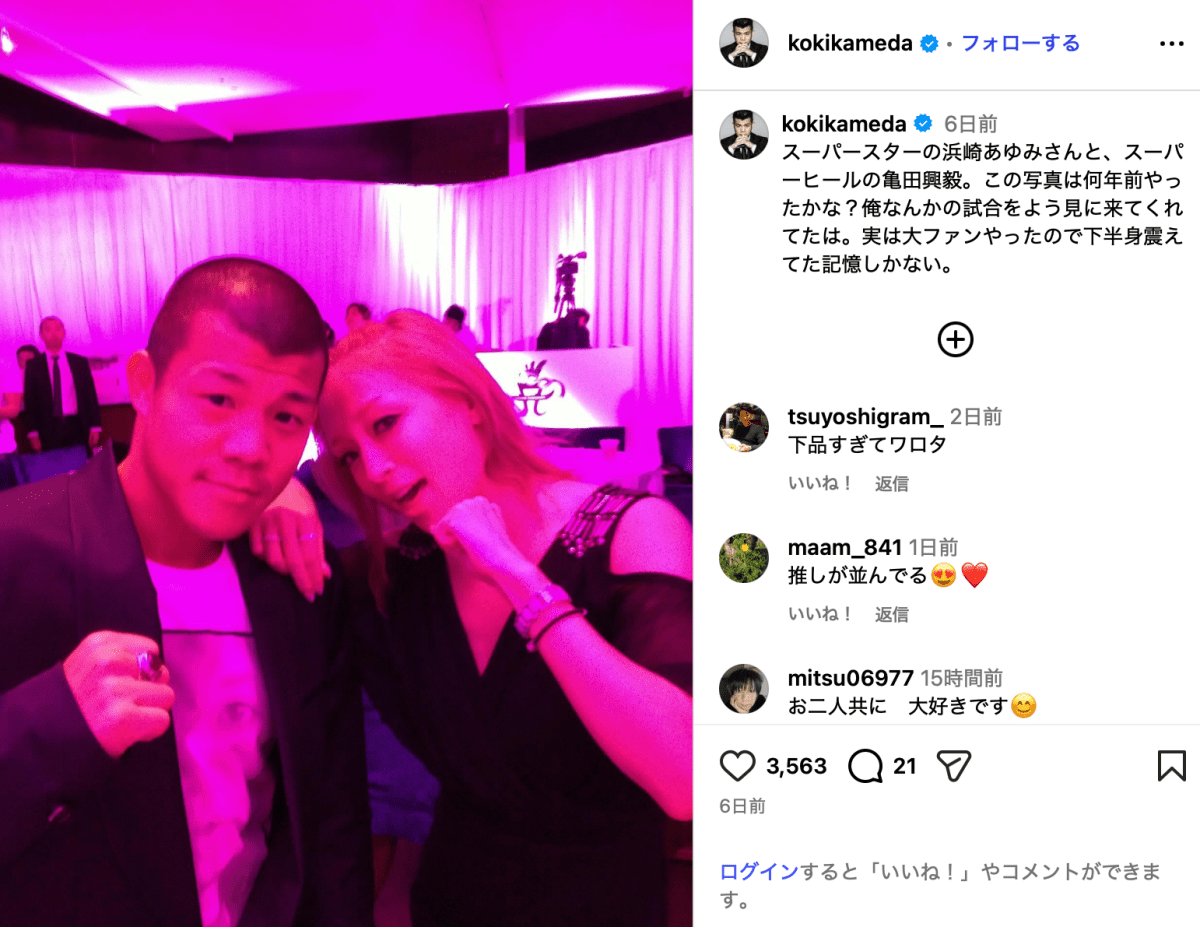 「スーパースターの浜崎あゆみさんと、スーパーヒールの亀田興毅」と投稿されたのは、亀田と世界的歌姫の浜崎あゆみ(47)のツーショット。亀田は「この写真は何年前やったかな?俺なんかの試合をよう見に来てくれてたは」とつづり、「実は大ファンやったので下半身震えてた記憶しかない」と振り返った。