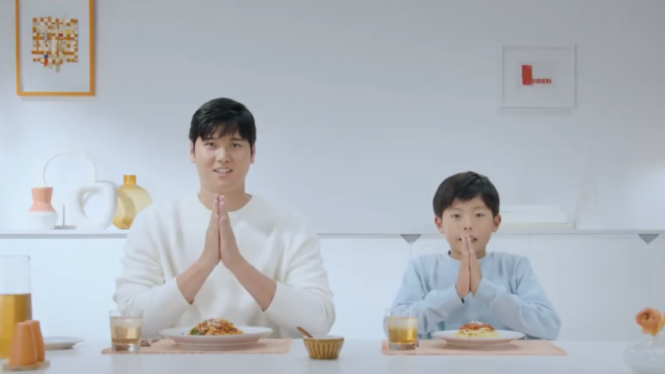 映像では、白を基調とした明るいダイニングテーブルに大谷と少年が並んで座り、パスタを前に手を合わせる姿が映し出されている。食卓で少年と会話する大谷が「おれ一番最初サードだったから」と語るシーンが公開され、少年時代のエピソードとともに自然体の表情が注目を集めている。「大谷翔平は食べることにこだわる」というテロップも表示され、食を通じた前向きなメッセージが印象的に描かれている。
