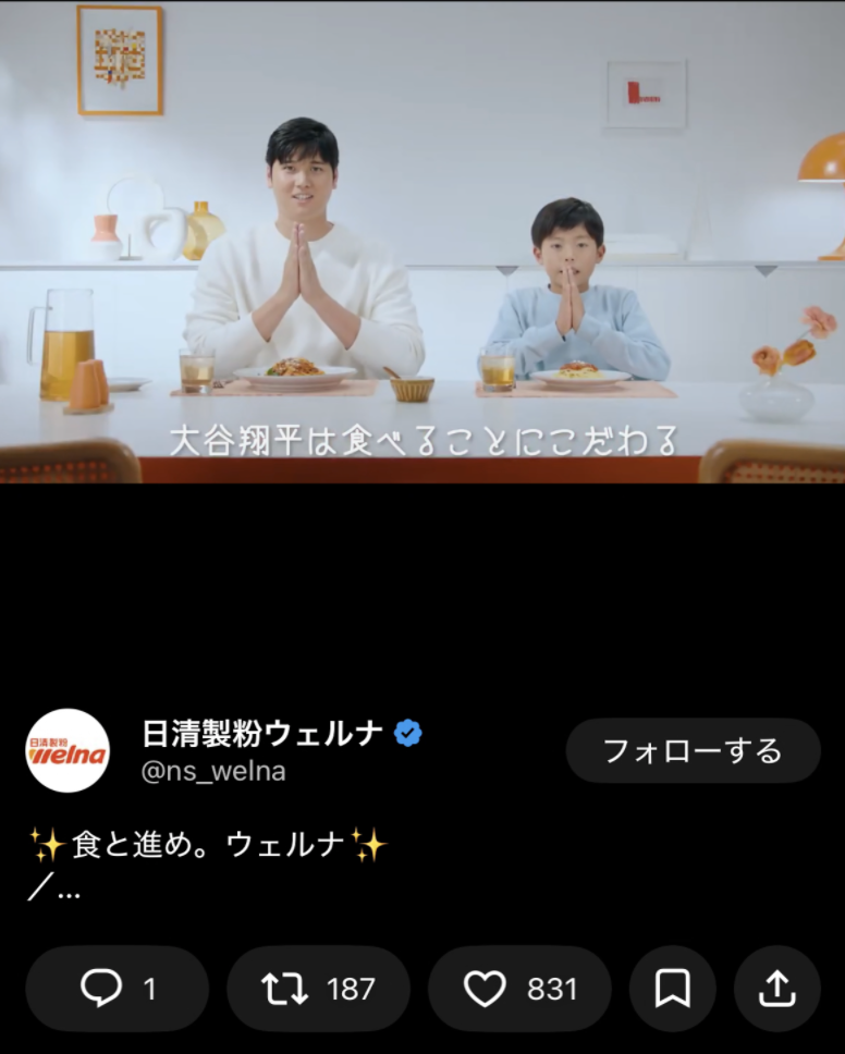 日清製粉ウェルナ公式Xは3月4日にインスタグラムを更新し、ドジャースの大谷翔平(31)が出演する新CMを公開した。投稿では、パスタブランド「マ・マー」の新テレビCMの一場面が紹介された。