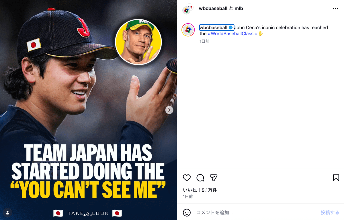 【画像】ジョン・シナ氏のジェスチャーを真似る大谷翔平(画像はWBC公式Instagramより引用)
