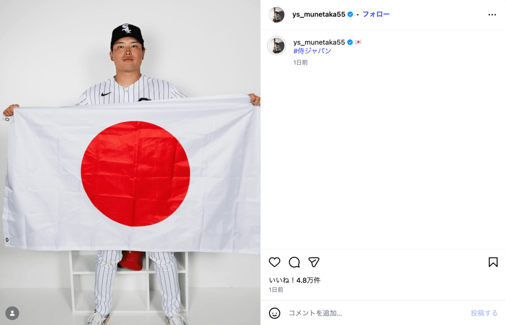 侍ジャパンは3月6日にWBC初戦を迎え、台湾を相手に13―0で大勝した。村上はこの日、所属するシカゴ・ホワイトソックスのユニフォーム姿で日本の国旗を両手で広げた写真を投稿。投稿には「#侍ジャパン」とひと言だけコメントを添えた。