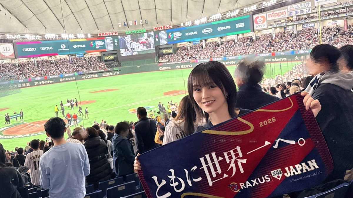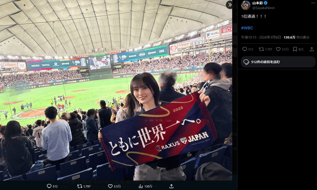 「1位通過!!!」というコメントと共に投稿された写真は、東京ドームの観客席で応援する姿を収めたもの。「ともに世界一へ」と書かれた侍ジャパンのタオルを手にした山本は、選手が集うグラウンド上を背景に、まぶしい笑顔を見せた。