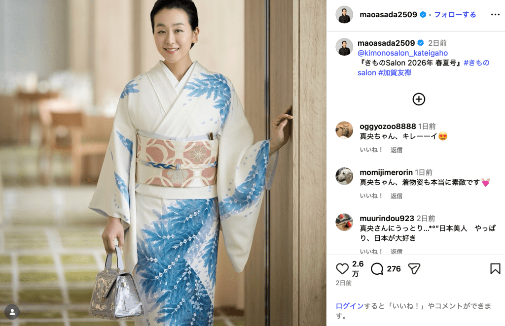 投稿されたのは、白地に青色の模様が入った加賀友禅の着物を着用した浅田の姿。右手にバッグを持ち、壁に手をついて笑顔を浮かべている。浅田はコメントで雑誌『きものSalon 2026年 春夏号』 の撮影であることにも触れた。