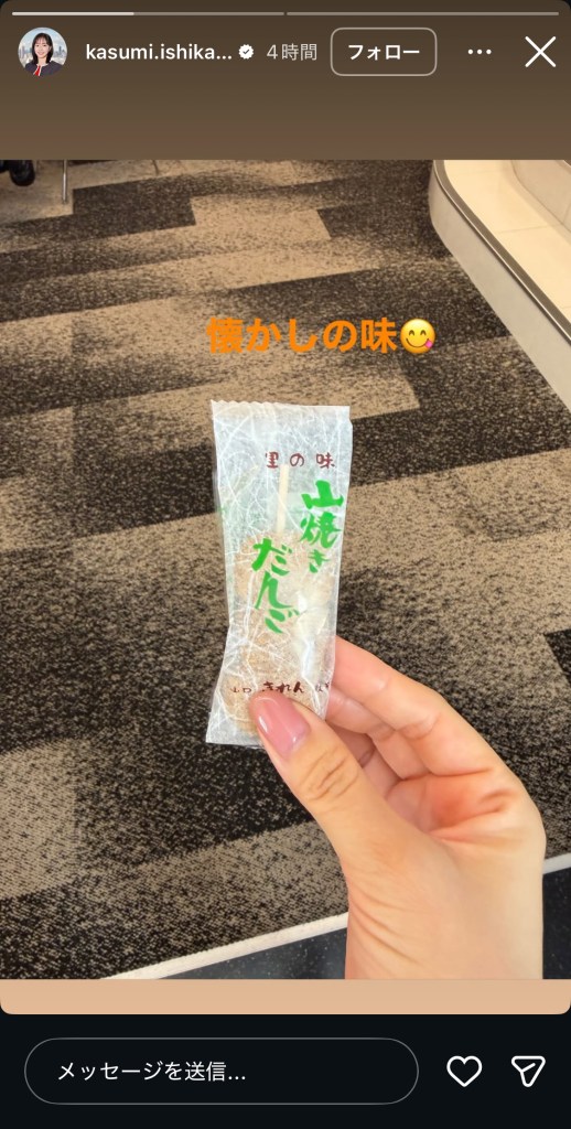 「懐かしの味」と投稿されたのは、「山焼きだんご」と書かれた個包装の団子を持った石川の手元の写真。「山焼きだんご」は山口県山口市のきれん製菓が販売する銘菓で、山口県出身の石川も懐かしさを覚えたようだ。