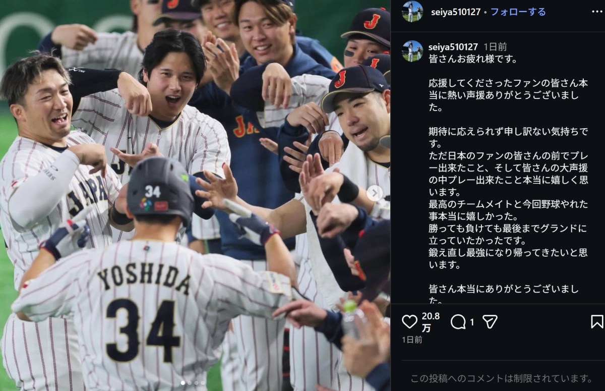 シカゴ・カブスの鈴木誠也(31)が16日、Instagramを更新。WBC準々決勝敗退と自身の負傷交代について心境を明かし、大きな反響を呼んでいる。