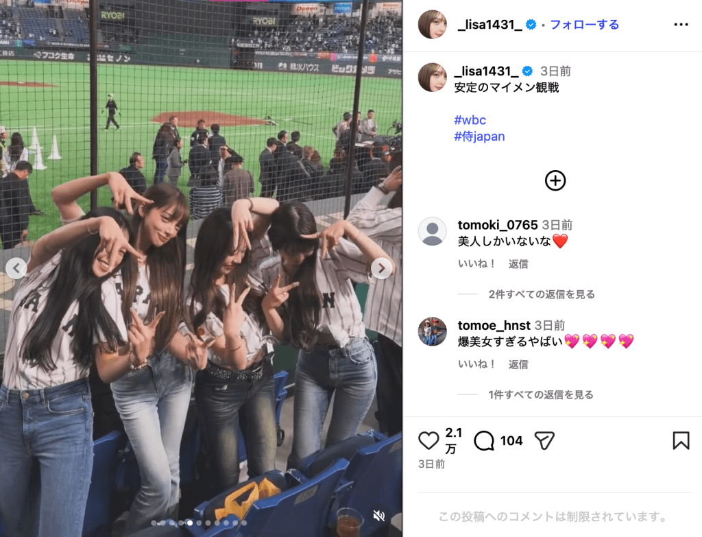 この投稿にはInstagramユーザーから「みんな美人すぎるし細すぎる」「ぶち可愛いメンツ」「世界一元気でアクティブな野球女子達」「美人4姉妹みたい」「スタイル良すぎるーー」「小園ガール強すぎる」といったコメントが寄せられた。