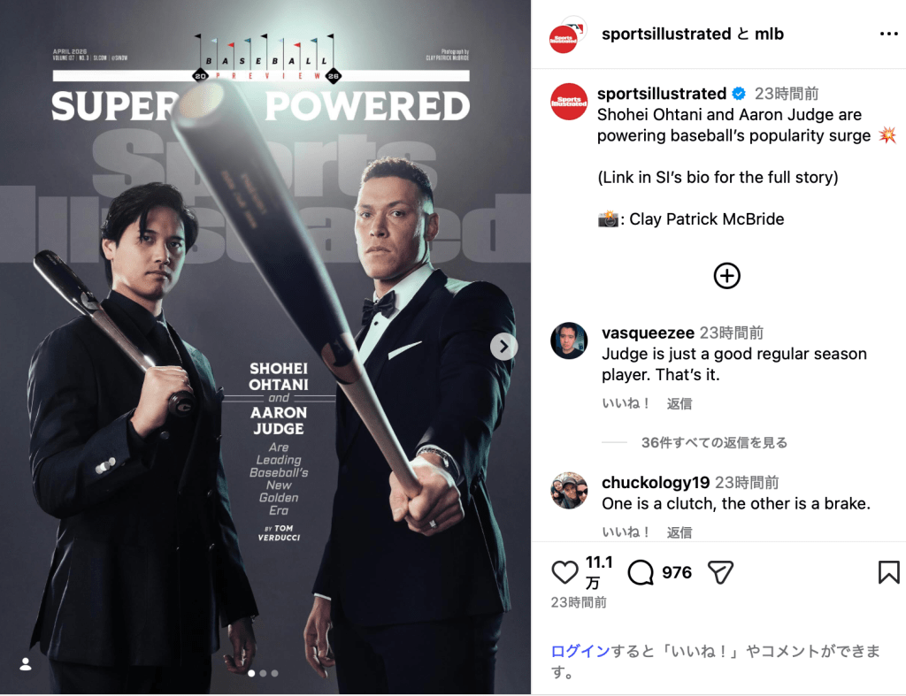 「Shohei Ohtani and Aaron Judge are powering baseball’s popularity surge」と投稿されたのは、スーツを着た大谷とジャッジのツーショット。大谷はバットを肩にかけカメラを凛々しく見つめ、ジャッジは蝶ネクタイを付けてバットをカメラに見せつけている。この投稿は12万6000超のいいねが付き、注目を集めている。