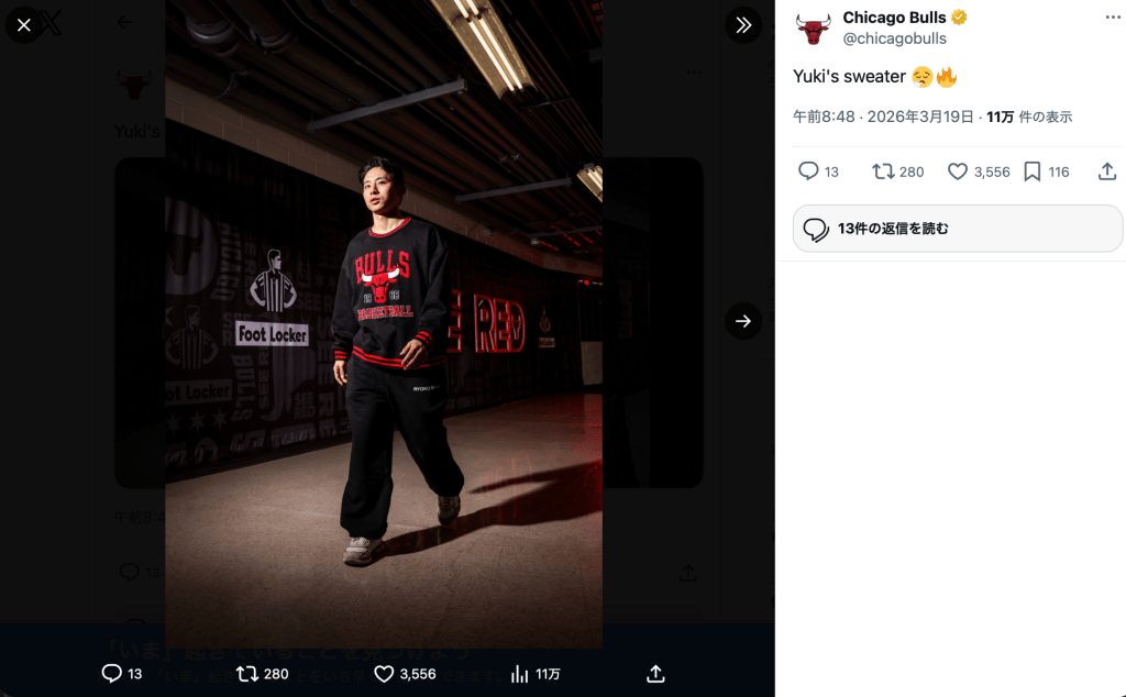 「Yuki’s sweater」と投稿されたのは、河村がブルズのロゴが描かれたスウェットを着用し、カメラを見つめる写真。黒と赤のツートーンでシンプルに決め、スポーティなコーディネートとなっている。その他、ポケットに手を入れて歩く動画も合わせて投稿された。