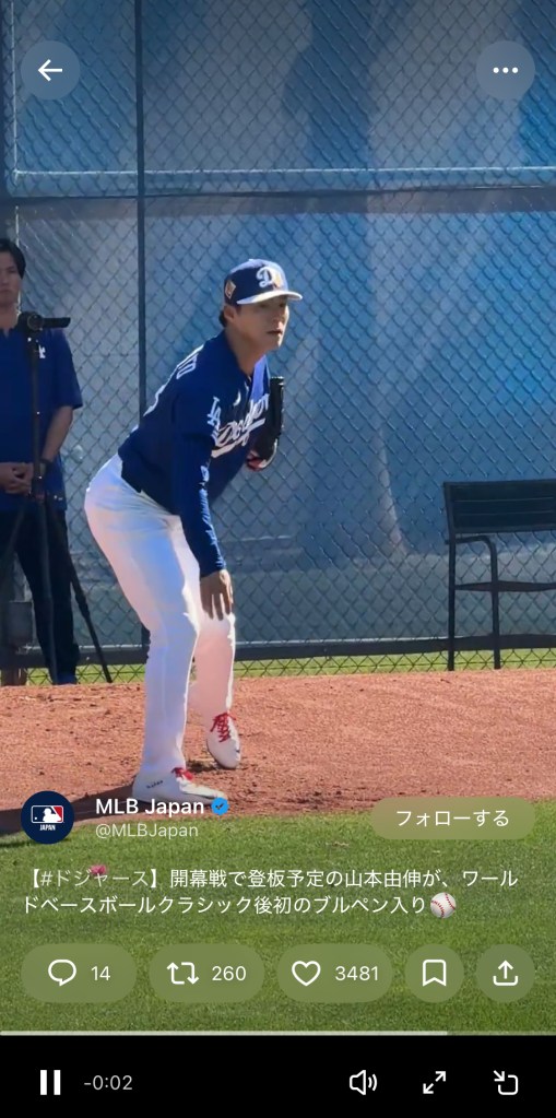 「開幕戦で登板予定の山本由伸が、ワールドベースボールクラシック後初のブルペン入り」と投稿されたのは、山本がブルペンで投げ込みをするトレーニング動画。約13秒ほどの動画で、構えから投球までの一連のシーンが収められている。