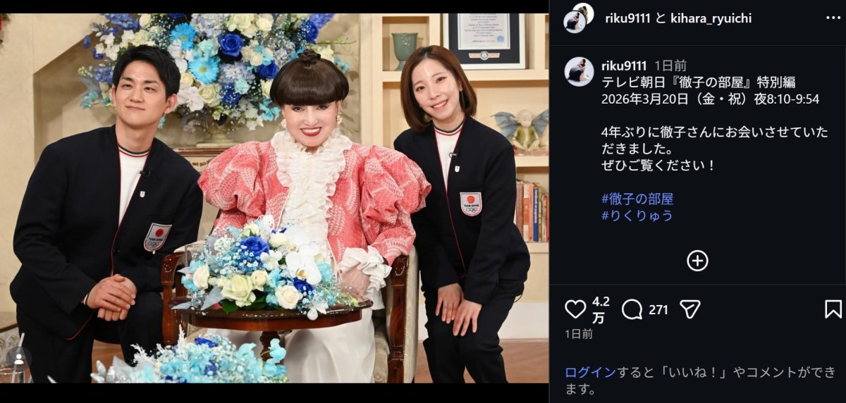 ミラノ・コルティナ五輪のフィギュアスケート・ペアで金メダルを獲得した三浦璃来(24)が20日、Instagramを更新。ペアを組む木原龍一(33)と「徹子の部屋 特別編」(テレビ朝日系)に出演した際のオフショットを公開し、大きな反響を呼んでいる。