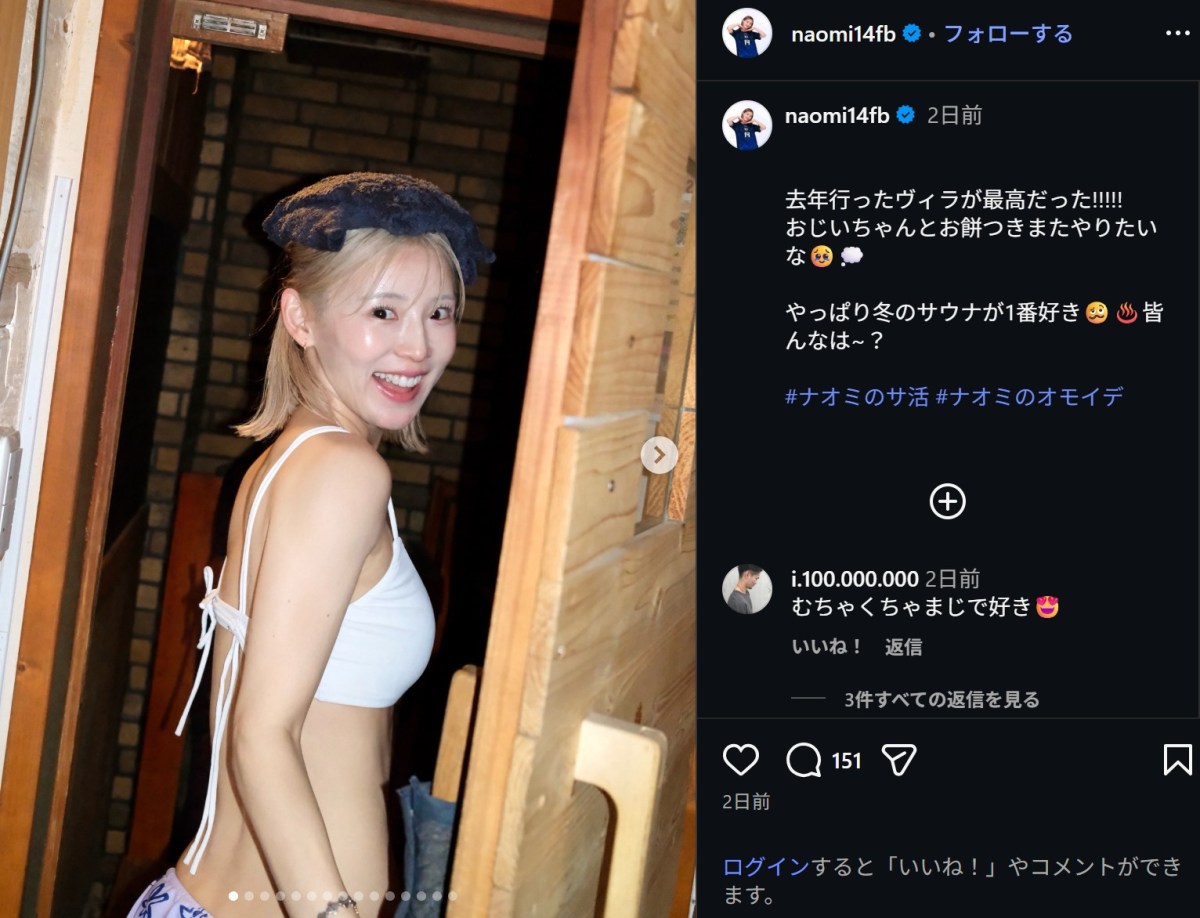 この投稿には、Instagramユーザーから「めっちゃ最強に激可愛いすぎる〜 スタイルも綺麗で美しいです」「きゃわー」「可愛いです」「直美さんのサ活最高です」といった称賛のコメントが寄せられている。