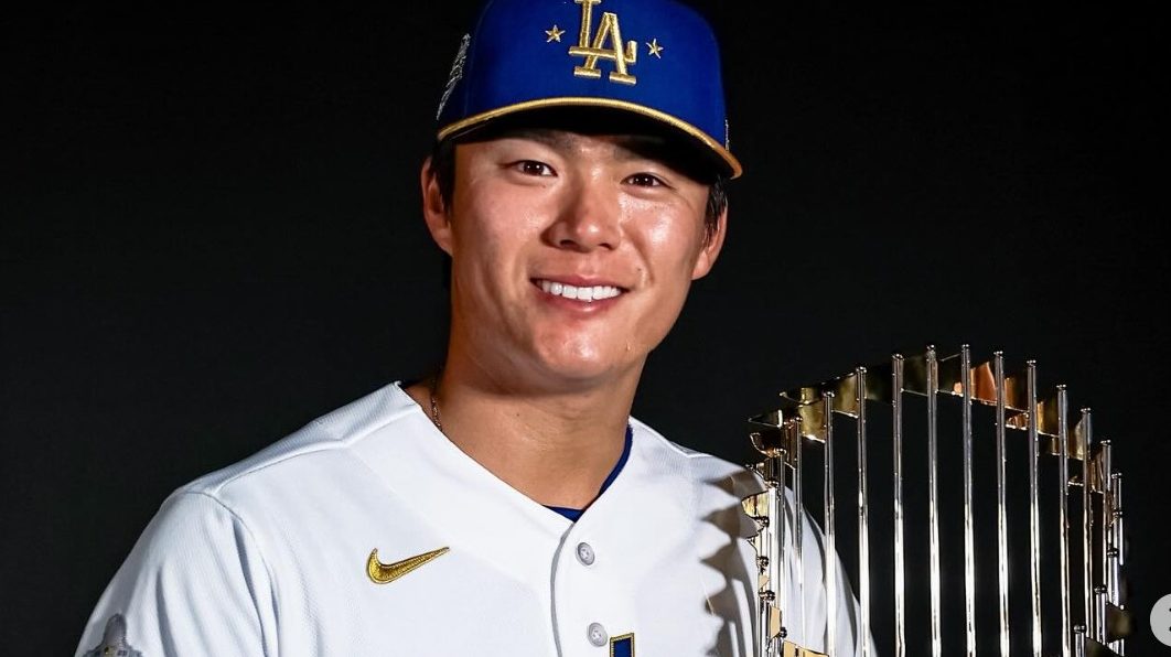 山本由伸、ド軍“黄金ユニフォーム”にファン熱狂 優勝トロフィーとの共演に「オリの金、ドの金、由伸は金が一番似合う」