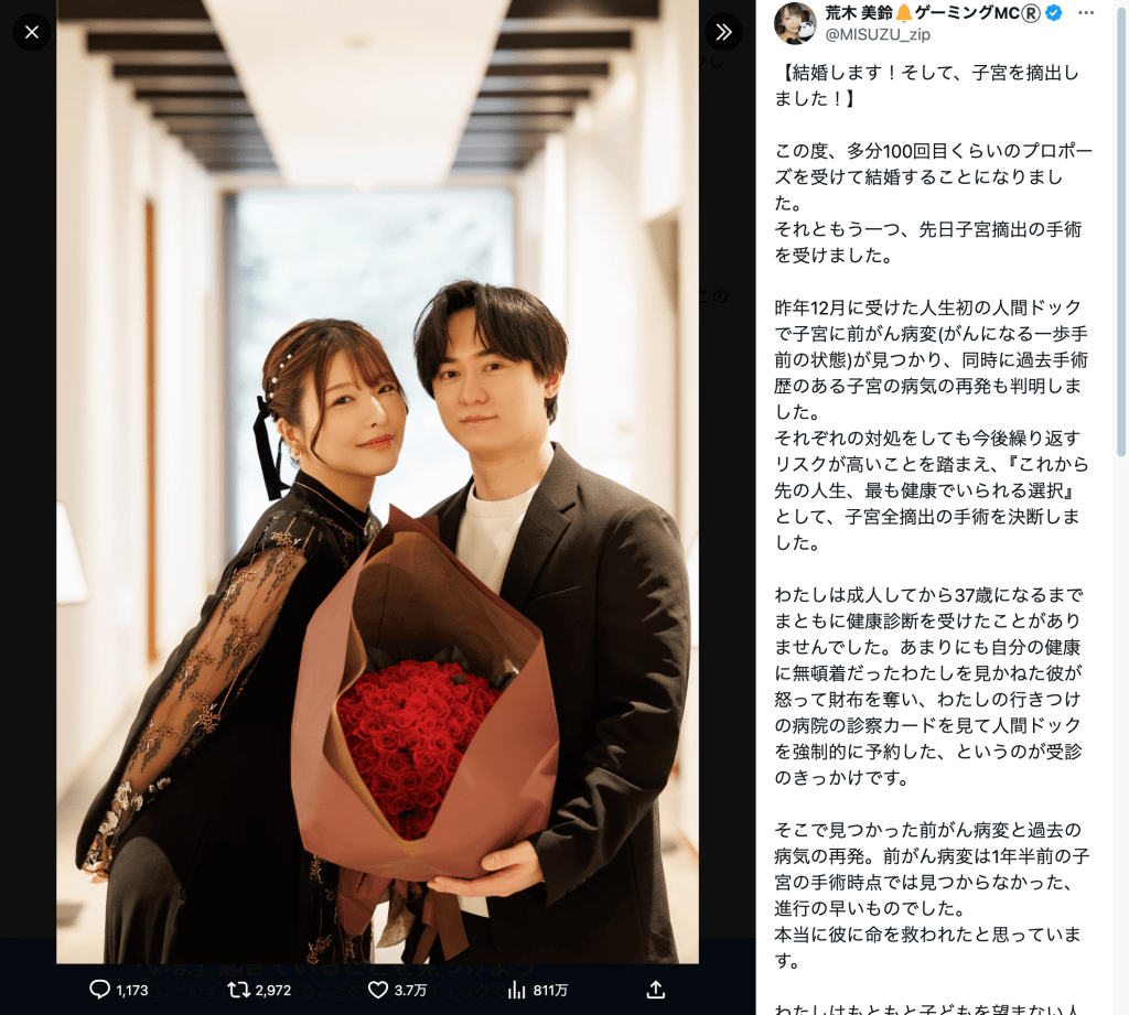 この投稿には、Xユーザーから「荒木さんおめでとうございます!! とても素敵なパートナーだなぁと感動しました」「お写真の表情が二人とも柔らかくてとっても素敵、末長くお幸せに!!」「命を守る選択と、新しい人生のスタートが重なった大切なタイミングですね。心から応援しています」「手術無事で本当に良かった…これからもお二人でずっと元気で幸せに」といった祝福の声が寄せられている。