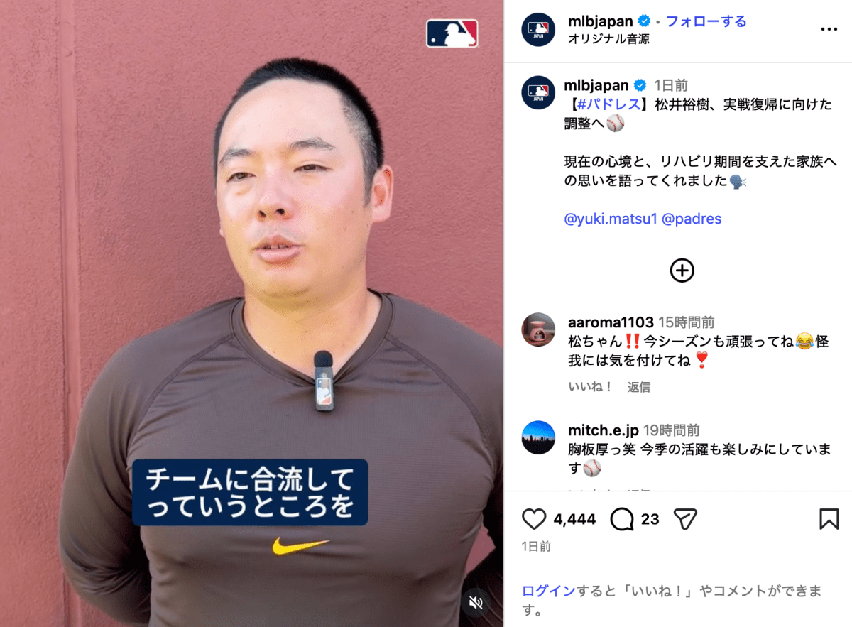 MLB Japanが3月21日、Instagramを更新。サンディエゴ・パドレス所属の松井裕樹(30)へのインタビュー動画を投稿した。