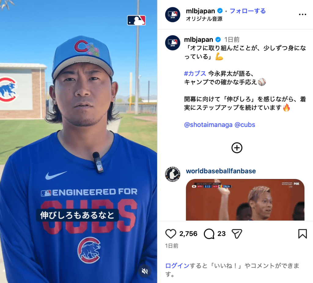 MLB Japanが3月24日、Instagramを更新。シカゴ・カブス所属の今永昇太(32)へのインタビュー動画を投稿した。