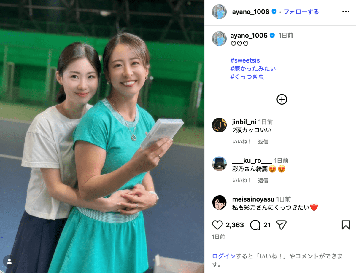 ハートの絵文字をつけて「#sweetsis #寒かったみたい#くっつき虫」と投稿されたのは、園田に元プロテニス選手の牛島里咲(29)が抱きつくツーショット。園田はエメラルドグリーンのウェアを着用し、カメラに向かって笑顔を見せている。