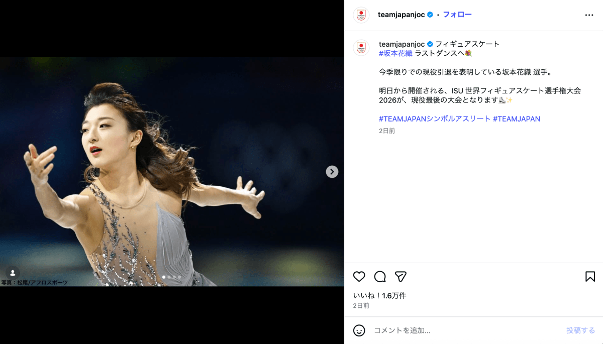 「#坂本花織 ラストダンスへ」と題してJOCが公開したのは、演技中の坂本の写真をまとめたもの。今季の写真や近年の写真をまとめた複数の写真の最後には、まだ表情に幼さの残る17歳の坂本の姿も見られた。JOCは坂本が今季限りで現役を引退することを改めて紹介。さらに「明日から開催される、ISU 世界フィギュアスケート選⼿権⼤会 2026が、現役最後の大会となります」とコメントし、坂本にとって今回の大会が最後になることを伝えた。