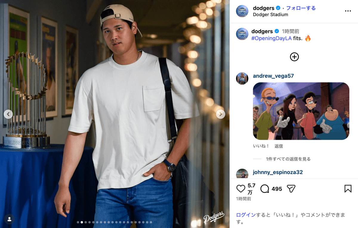 「#OpeningDayLA fits.」と投稿されたのは、大谷の球場入りの様子。大谷はキャップの白Tシャツ、ジーンズというシンプルなコーディネートに身を包んで登場。その他、ムーキー・ベッツ(33)や佐々木朗希(24)らの写真も投稿された。