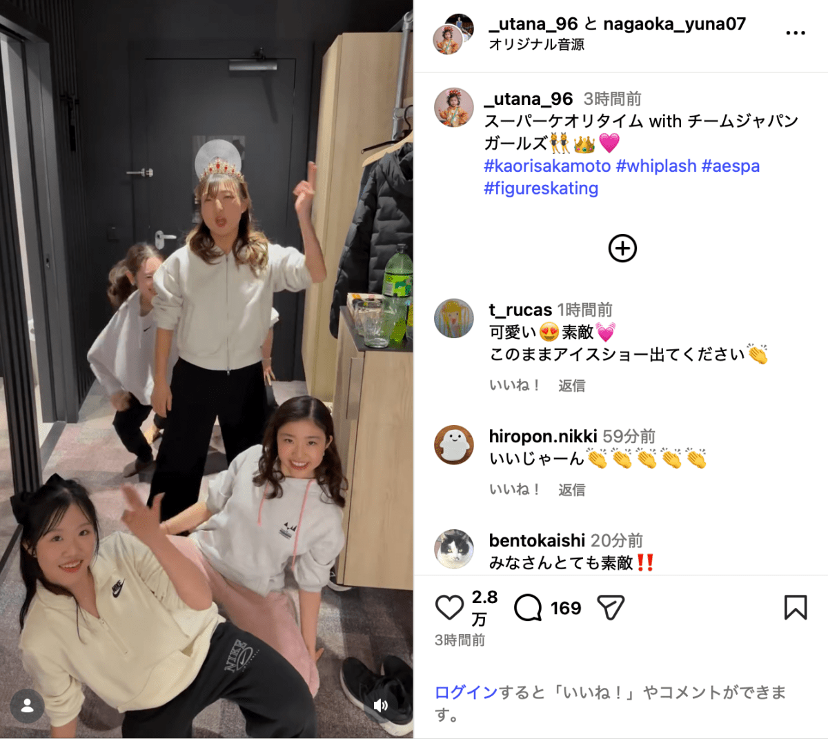 「スーパーケオリタイム with チームジャパンガールズ」と投稿されたのは、吉田と坂本、長岡柚奈(20)、中井亜美(17)、千葉百⾳(20)ら5選手がカメラに向かって踊るダンス動画。韓国ガールズグループ・aespaの曲に合わせ、王冠をかぶった坂本がカメラに向かって笑顔でポーズを決めた。坂本は世界選手権で優勝を飾り、現役引退を表明している。