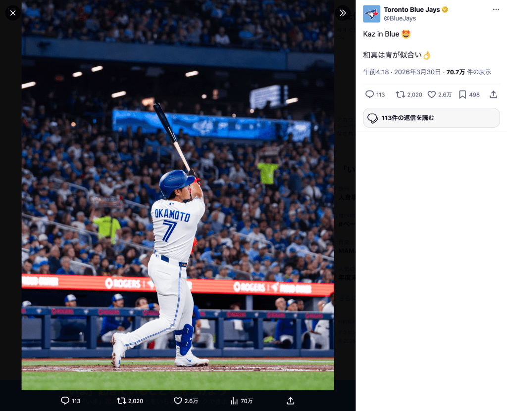 ブルージェイズ公式Xは3月30日に投稿を更新し、トロント・ブルージェイズの岡本和真(29)が打席に立つ写真を公開した。投稿では、岡本が青を基調としたチームカラーの中でプレーする姿を取り上げ、「和真は青が似合い」と、ややたどたどしい日本語で紹介。メジャーデビュー直後の高揚感をにじませる1枚となっている。