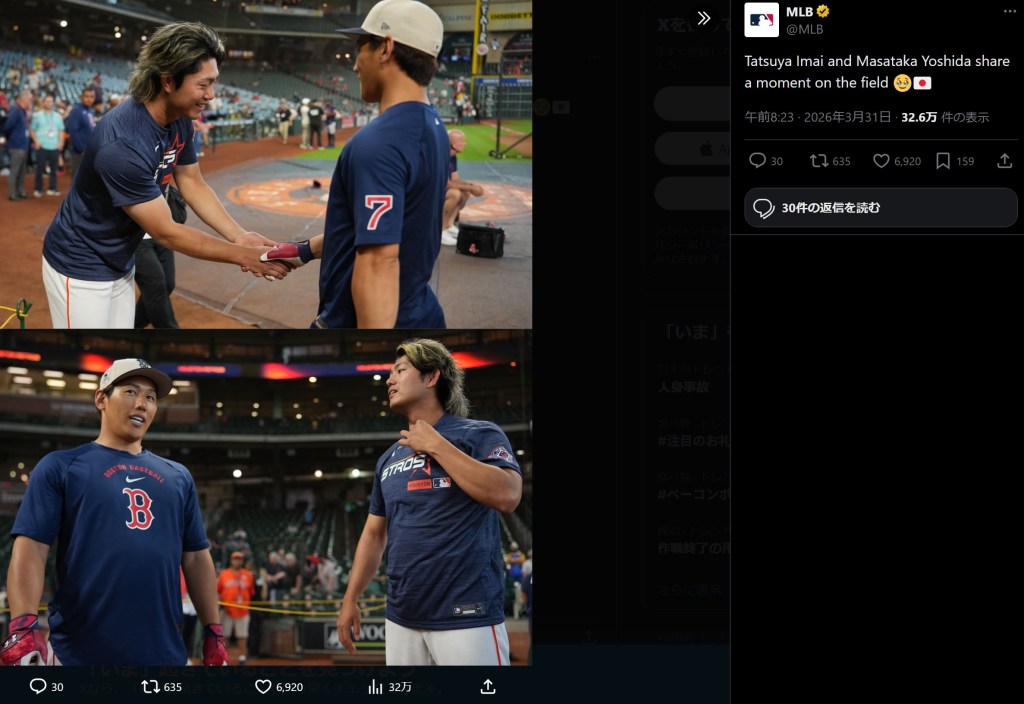 MLBが8日、公式Xを更新。ヒューストン・アストロズの今井達也(27)と、ボストン・レッドソックスの吉田正尚(32)が、メジャーリーグの舞台で再会したことを伝え、写真を投稿した。