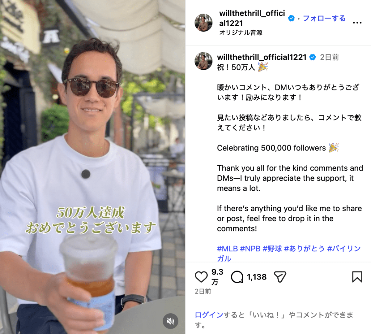 大谷翔平(31)の通訳とアナリストを務めるウィル・アイアトン(37)が3月29日、Instagramを更新。Instagramフォロワーが50万人を突破したことを報告した。