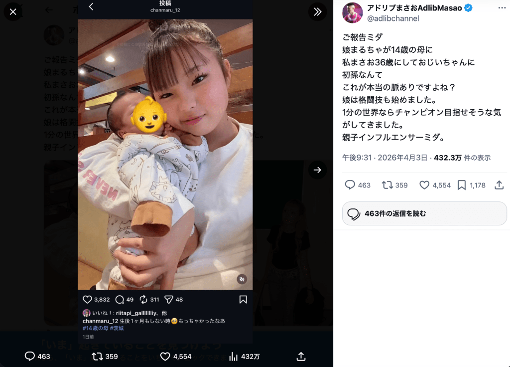 「ご報告ミダ」と投稿されたのは、まさおの娘・まるちゃが赤ちゃんを持って笑顔を見せる写真。14歳での出産となり、まさおは「私まさお36歳にしておじいちゃんに 初孫なんて これが本当の脈ありですよね?」とコメントし、「娘は格闘技も始めました。1分の世界ならチャンピオン目指せそうな気がしてきました。親子インフルエンサーミダ」と締めくくった。