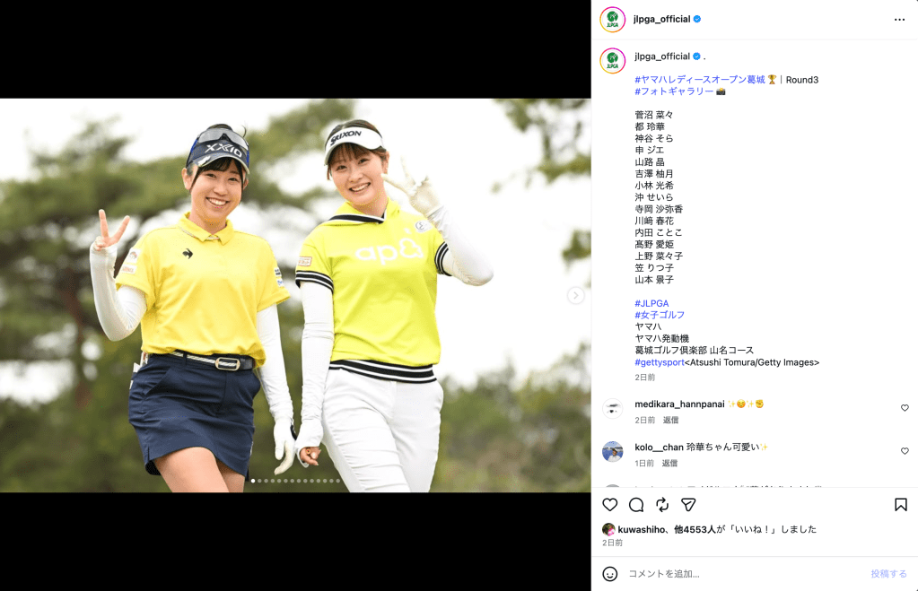 日本女子プロゴルフ協会(JLPGA)公式Instagramは4月4日に投稿を更新し、「ヤマハレディースオープン葛城」第3日のフォトギャラリーを公開した。静岡県袋井市の葛城ゴルフ倶楽部 山名コースで行われた大会の様子を伝える内容で、投稿には菅沼菜々(26)と都玲華(22)が並んだ笑顔の2ショットも収められている。