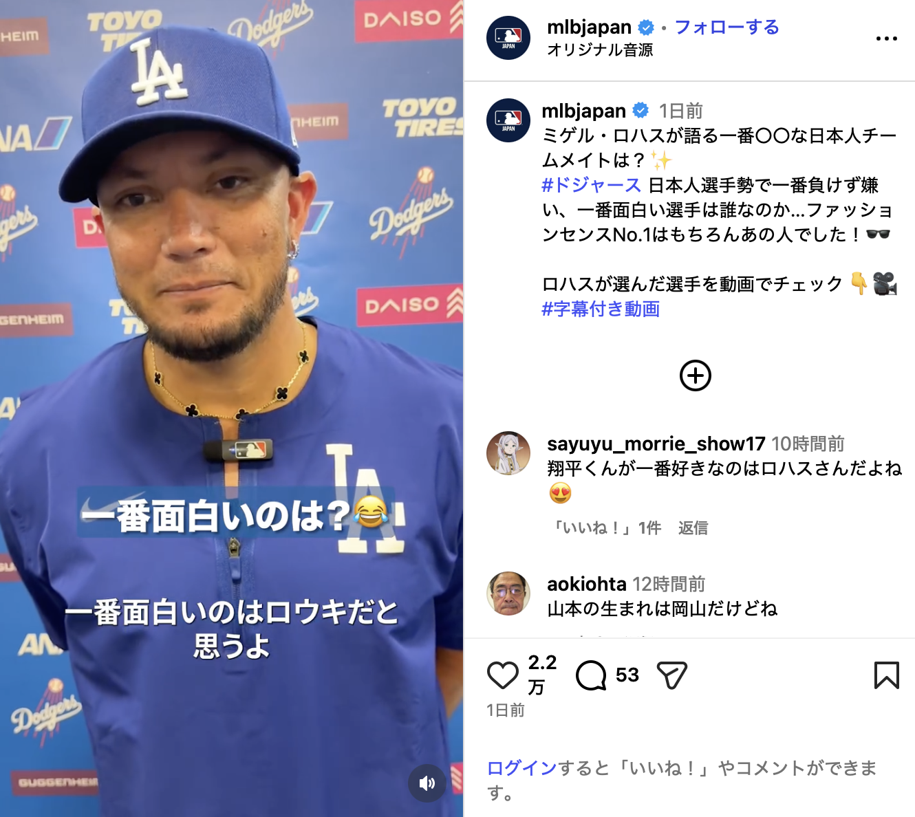 「チームで一番面白いのは?」 ロハス、大谷翔平らド軍日本人3選手の裏話を語り「意外すぎる」「こういうのめっちゃ好き!」と反響