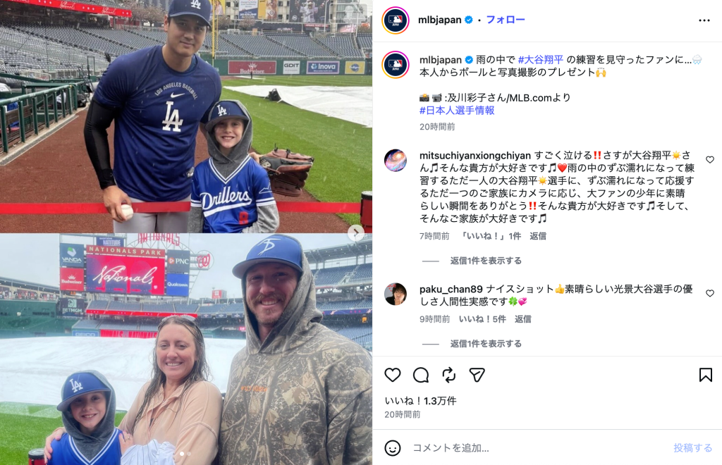 この投稿には、Instagramユーザーから「大谷選手らしい神対応ですね」「神です」「こういうさりげない行動が、GOATある所以ですね」「かっこいい振る舞い」「カッコよすぎる」「子供さんとても嬉しかったでしょうね」「宝物ですね」などコメントが寄せられた。