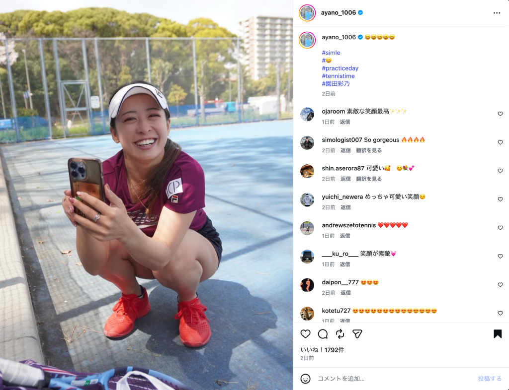 女子プロテニス選手の園田彩乃(30)が4月6日に自身のInstagramを更新し、練習中のオフショットを公開した。投稿では、屋外コートでしゃがみ込んだ笑顔の1枚を披露。絵文字とともに「#practiceday」「#tennistime」と添え、明るい表情が印象的な近況ショットを届けている。